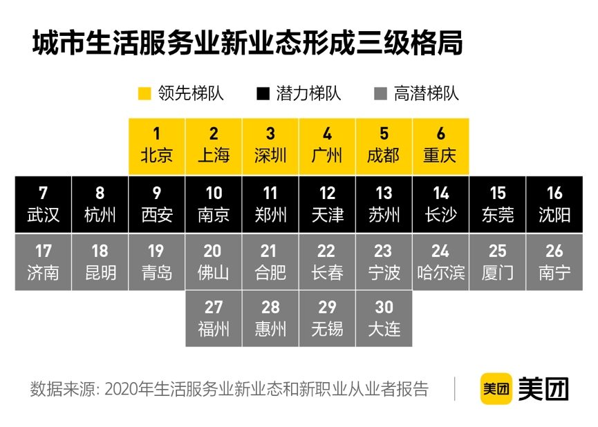 美团研究院研发了生活服务业新业态城市评价体系,根据新基建即新技术业态、消费力即新体验业态、创新阶层即新职业从业者三大纬度,对城市新业态发展情况做评估。