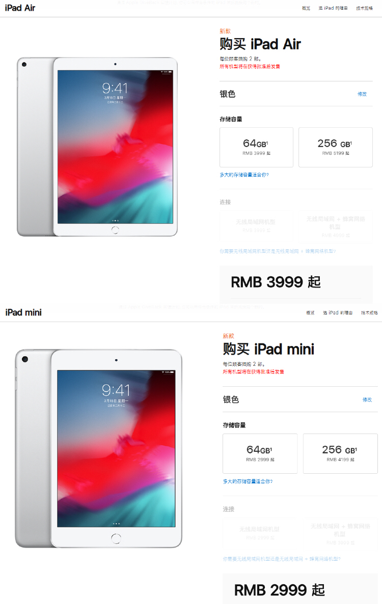苹果官网显示,新款iPad air售价为人民币3999元起,iPad mini售价为2999元起。