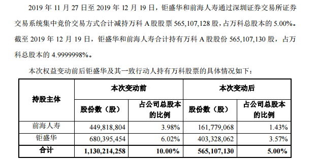 万科A晚间公告称,公司股东钜盛华与前海人寿近期减持5.65亿股的股份,占公司总股本的5%,持股比例降至4.9999998%。