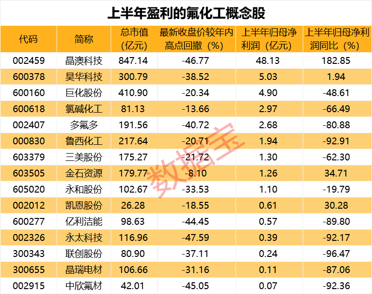 以最新收盘价较年内高点的回撤幅度来看,上半年业绩实现盈利的15只个股中,9股股价回调超30%,其中,永太科技、晶澳科技、中欣氟材、亿利洁能、多氟多股价均回调超40%。(数据宝)