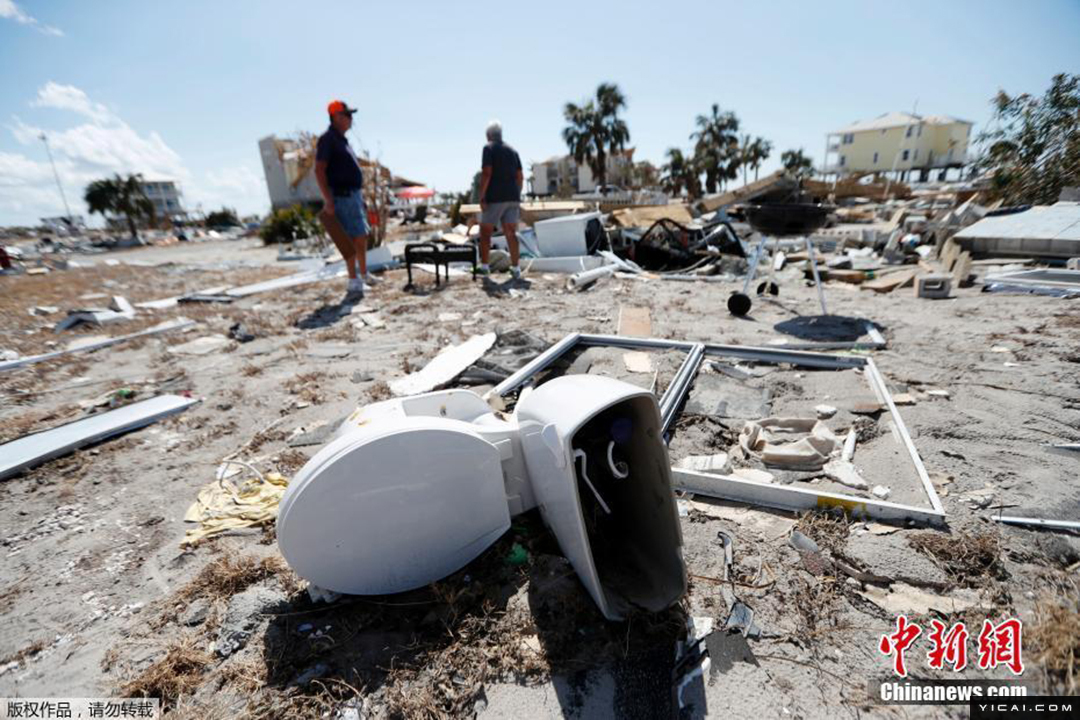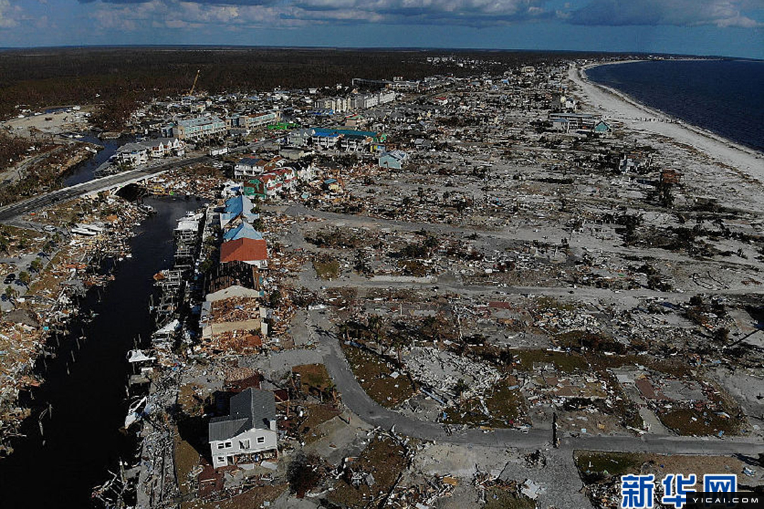 当地时间2018年10月17日,美国佛罗里达州墨西哥滩,飓风“迈克尔”过境后一片废墟。16日,遭受“迈克尔”飓风灾害最严重地区美国佛罗里达州贝县警察局发布消息,该县有12人在飓风“迈克尔”袭击中遇难。这使“迈克尔”在美致死人数增加到至少26人。