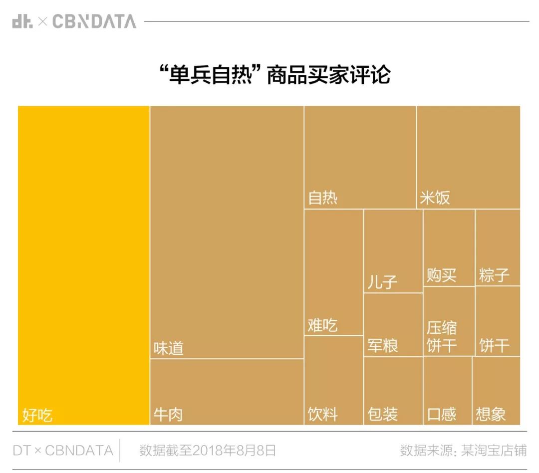 菜品数量重要,但味道也很关键。单兵自热食品的味道,究竟怎么样?DT君选取了淘宝销量第一的单兵自热商品,对买家评论做了分析: