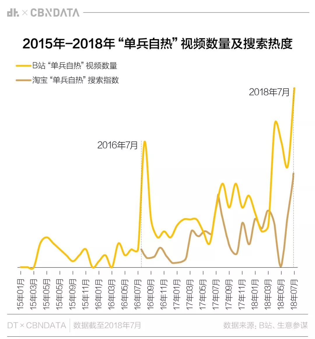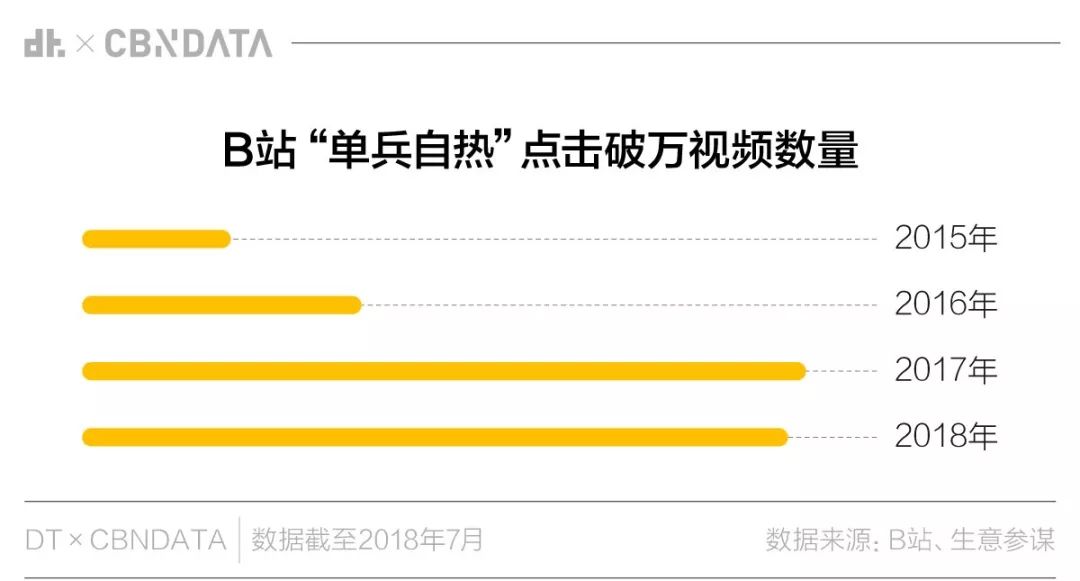 DT君采集了B站2015年至2018年所有含“单兵自热”关键词的视频,发现这种特殊食物的测评年年有,这两年格外多,7月更是创历史新高。