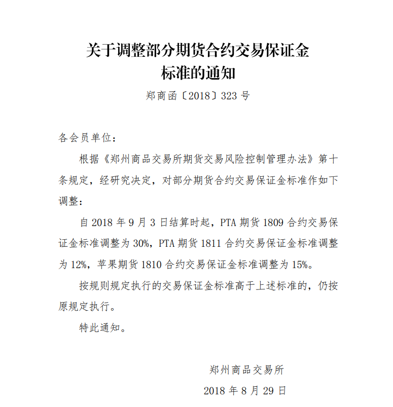 公告称,自2018年9月3日结算时起,PTA期货1809合约交易保证金标准调整为30%,PTA期货1811合约交易保证金标准调整为12%,苹果期货1810合约交易保证金标准调整为15%。