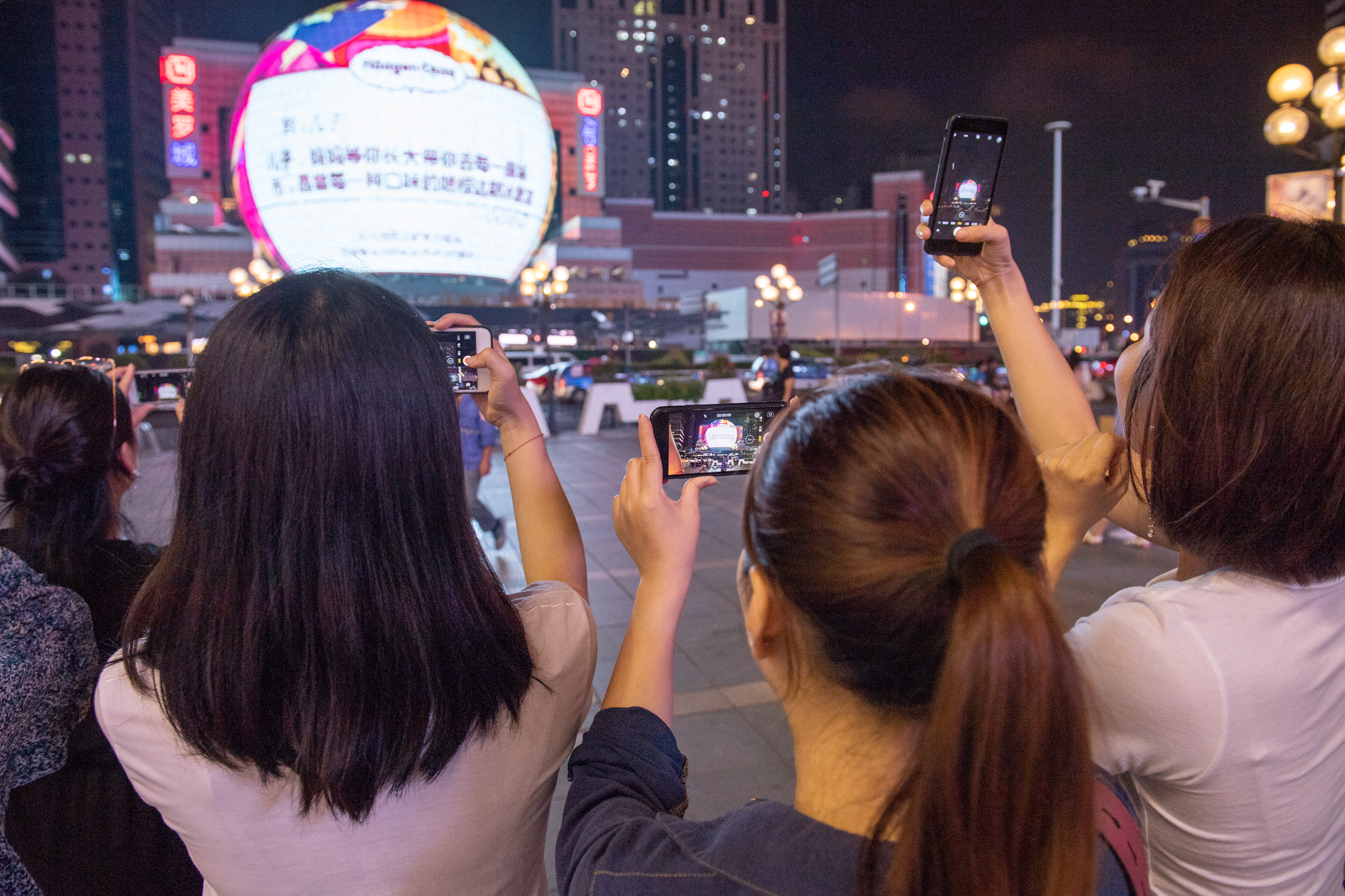 美罗城的大型“圆月”投幕与空中的圆月遥相呼应,成为了这个秋夜上海最为夺目的一道风景,投屏上的一条条动人的留言,让原本步履匆匆的行人忍不住慢下脚步,与哈根达斯共度这个热闹和爱意交织的非凡时刻。