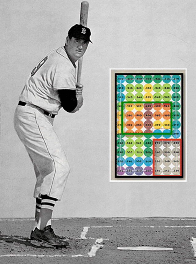 巴菲特还用传奇棒球球星泰德·威廉斯的著作《击球的科学》来解释自己的投资理念——“等待最合适的投球,然后击打”。《击球的科学》一书中有一张图表,将击球的好球区分成了77个棒球大小的小方块。泰德·威廉斯在书中举例,如果在挥棒舒适区击打,那么击打率是400;如果在好球区内的较低位置击打,那么击打率就只有230。