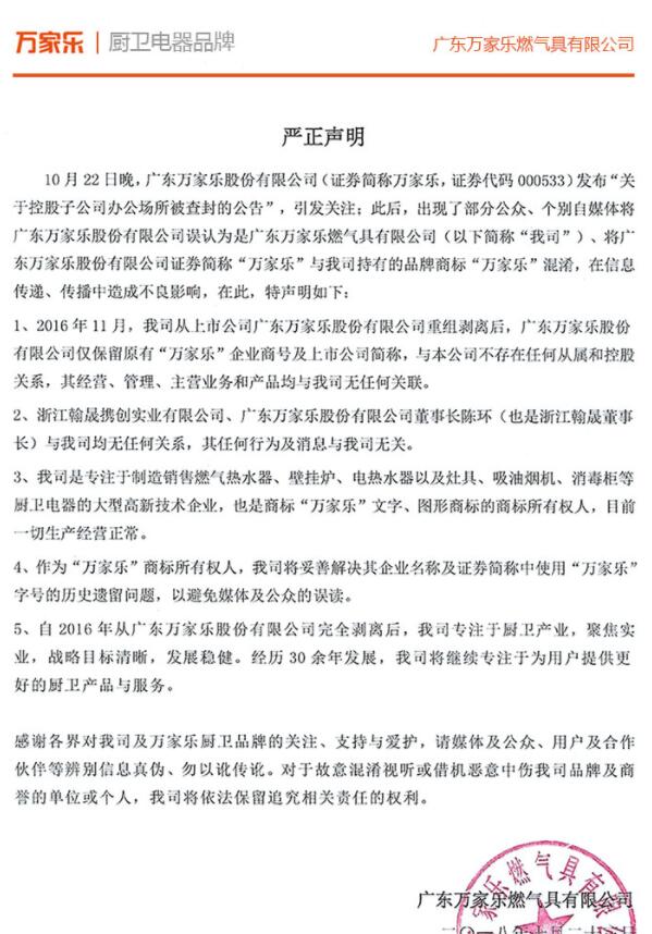 声明中指出,2016年,广东万家乐燃气具有限公司从上市公司广东万家乐股份有限公司重组剥离后,广东万家乐股份限公司仅保留原有“万家乐”企业商号及上市公司简称,与广东万家乐燃气具有限公司不存在任何从属和控股关系,其经营、管理、主营业务和产品均与其无任何关联。浙江翰晟携创实业有限公司、广东万家乐股份有限公司董事长陈环(也是浙江翰晟董长)与广东万家乐燃气具有限公司均无任何关系,其任何行为及消息与其无关。广东万家乐燃气具有限公司是制造销售燃气热水器、壁挂炉、电热水器以及灶具、吸油烟机、消毒柜等厨卫电器的高新技术企业,也是商标“万家乐”文字、图形商标的商标所有权人,目前一切生产经营正常。