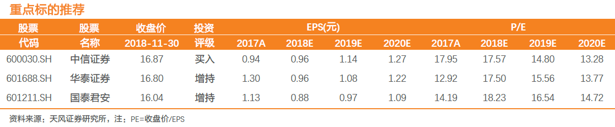 广发证券建议持续关注头部券商:中金公司(3908.HK)、中信证券(600030.SH)、华泰证券(601688.SH)等,对应2018年PB估值分别为1.34、1.29、1.27倍。