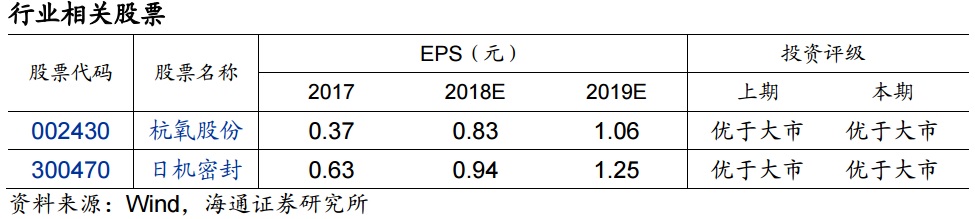 海通证券认为,设备龙头厂商将受益于此轮以炼化和煤化工行业为代表的龙头厂商扩张景气周期,看好杭氧股份(002430.SZ)、日机密封(300470.SZ),建议关注纽威股份(603699.SH)。
