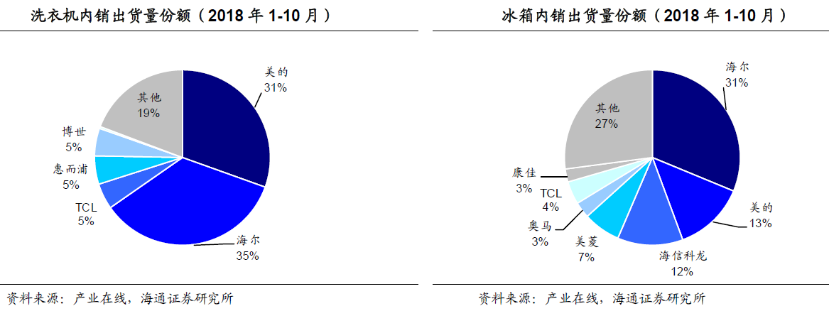 海通证券表示,洗衣机双龙头年内内销份额提升显著。美的年内累计份额同比提升1.3个百分点达30.5%,海尔提升1.5个百分点达34.8%。海尔外销增速年内显著优于行业,份额同比提1.9个百分点达11.8%。年内冰箱内销整体虽表现仍不佳但龙头表现优于行业,集中度依然呈现提高趋势,1-10月行业前四集中度同比提升3.0个百分点至63.3%,其中海尔同比提升2.6个百分点至31.2%,一超多强格局稳固。