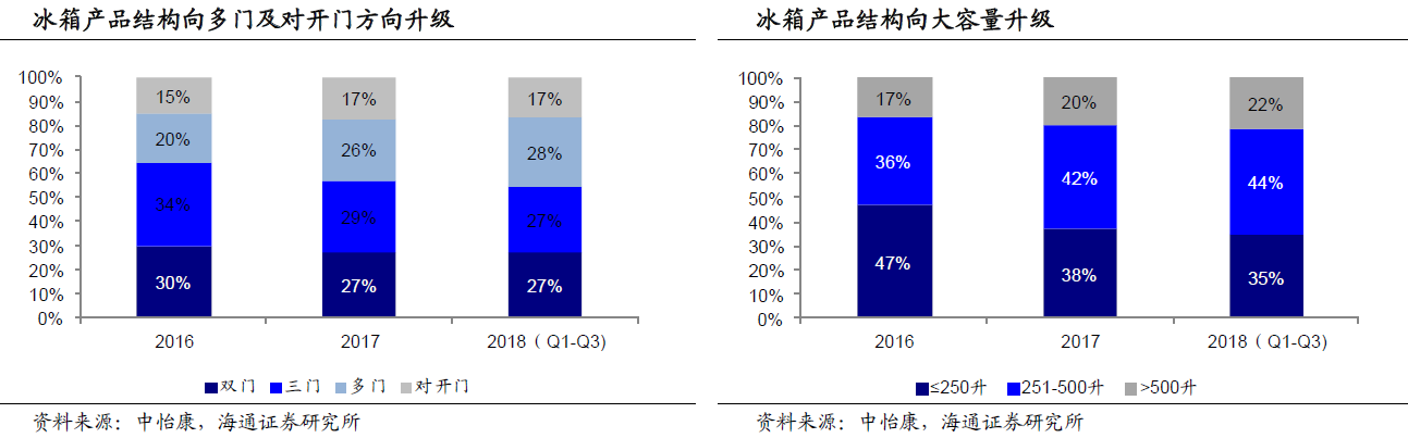 2018年洗衣机行业整体增长由滚筒增长带动,截至2018年三季度洗衣机滚筒销量占比已上升至39%。波轮向滚筒的结构升级叠加龙头今年龙头的高端化战略下,洗衣机均价提升显著。据中怡康数据,2018年前三季度行业均价累计提升10.5个百分点。海尔品牌提价11个百分点,美的及小天鹅品牌提价17个百分点左右。冰箱体现出类似趋势,行业缩量但产品结构升级持续推进。大容量、多门、对门冰箱占比持续提升,产品结构升级助推行业均价提升,2018年前三季度均价同比上提13个百分点,海尔品牌提价12个百分点以上,美的品牌提价27个百分点。