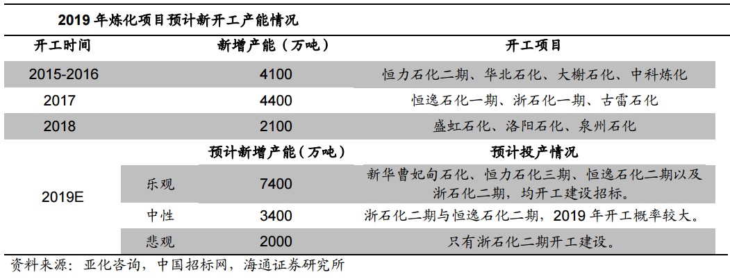 根据情景分析,海通证券预计2019~2020年新增炼油项目新开工产能规模在乐观/中性/悲观三种情景下,分别有望达到7400/3400/2000万吨/年。综合来看,海通证券认为2019年新开工的炼化项目增量可能超过2018年,对于设备采购有望形成新的增量。