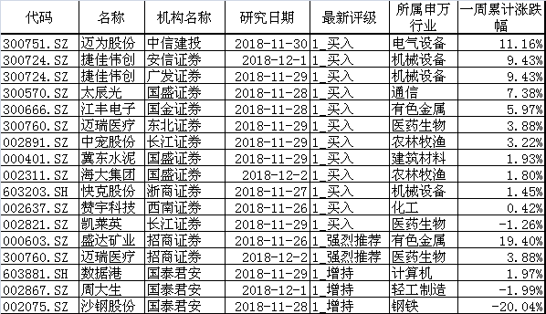 上周沪深两市股指止跌回稳,上证综指于2600点下方强势震荡。机构对上市公司关注度有所回升。截至12月2日,两市共有101家公司获得机构评级,数量较前周有所回升。从行业板块来看,化工、医药生物板块继续获得机构较多关注。此外,机械设备以及计算机板块也有多家公司获得机构买入评级推荐。个股方面,华东医药(000963.SZ)、乐普医疗(300003.SZ)以及中国国旅(601888.SH)均获得6家以上机构买入评级推荐。