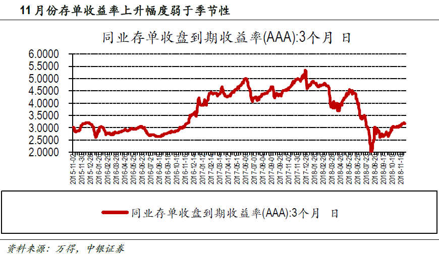 中银国际认为,在当前市场对于货币政策的分歧渐渐减少,宽松预期下跨年时点的备付性需求将较去年明显回落。如果以流动性溢价的指标来进行观察,今年在11月中尽管同业存单收益率也有所上行,但上行幅度较前两年相比有明显趋缓,3个月期限存单收益率在2016年和2017年分别上升34个基点和41个基点,今年11月上升15个基点仅比2015年同期的上行7个基点略高。整体来说,中银国际判断12月份上半月中资金面保持在均衡偏松;下半月将维持在均衡,当中个别时点可能出现偏紧,但整体来说跨年时点预计要比去年同期改善明显。