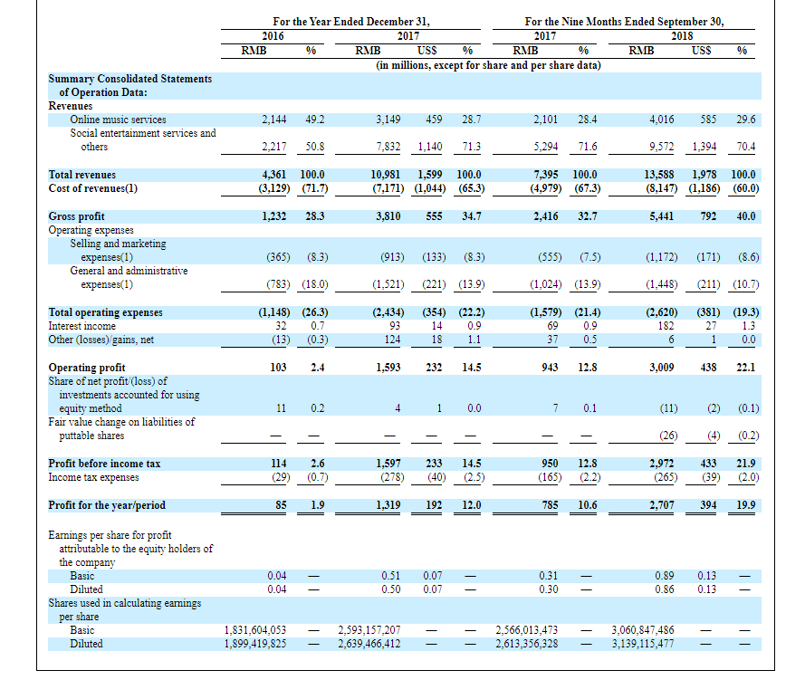 招股书还公布了2018年前三季度业绩,腾讯音乐前三季度营收为135.88亿元人民币,净利润为27.07亿元人民币。