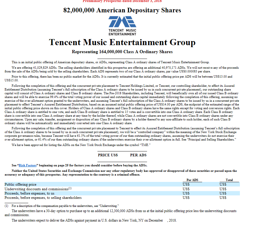 12月3日,腾讯音乐娱乐集团向美国证监会(SEC)递交了更新的招股书,招股书显示,腾讯音乐计划发行4102.98万股美国存托股(ADS),售股股东还将发售额外4097.02万股ADS。发行价区间定为13-15美元。