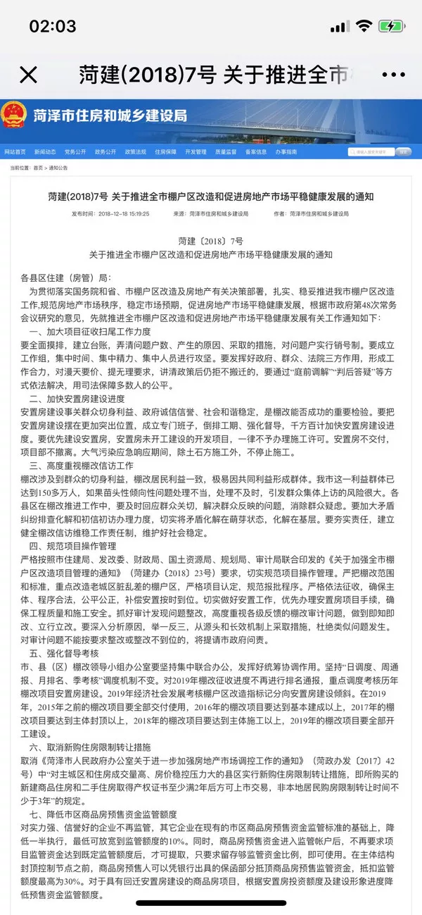 菏泽市住房和城乡建设局官网18日下午发布《关于推进全市棚户区改造和促进房地产市场平稳健康发展的通知》(以下简称“通知”)。