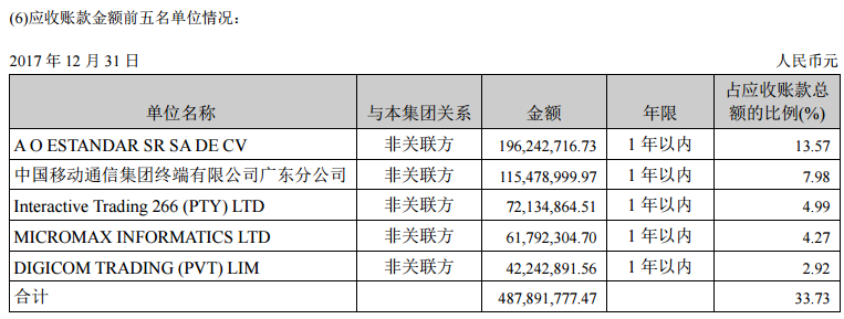 另外,润泰对天珑移动应付账款高达14.05亿元,那么在创智5的财务报表上,应该稳列应收账款前五大客户了。但2017年创智5应收账款的前五大客户,却不见润泰的踪影。