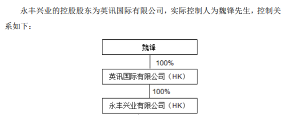 2013年4月,魏锋通过旗下英讯国际有限公司,收购永丰兴业,从而间接持有景山创新100%股权。