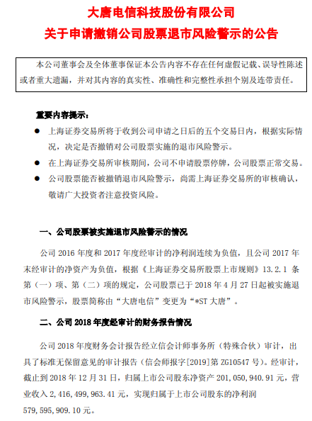 同时,*ST大唐表示,公司2016年度和2017年度经审计的净利润连续为负值,且公司2017年末经审计的净资产为负值,公司股票已于2018年4月27日起被实施退市风险警示,股票简称由“大唐电信”变更为“*ST 大唐”。