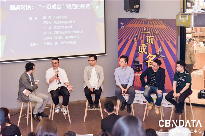在沙龙现场的圆桌环节,第一财经资深记者何天骄作为圆桌主持,和知名小说家路内、观达影视副总经理严俊杰、掌阅文学副总裁杜城、百草味企划中心品牌总监周云飞,以及CBNData星数负责人王振涵一起就“‘一页成名’背后的秘密”展开热议,探讨影视文学IP商业化开发及运营这一条链路上的重要环节,以及IP影视剧市场的未来发展趋势。