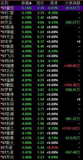 周一早盘,ST板块再度重挫,截至发稿,*ST富控、*ST仁智、*ST新海、*ST天圣等逾20只个股跌停。