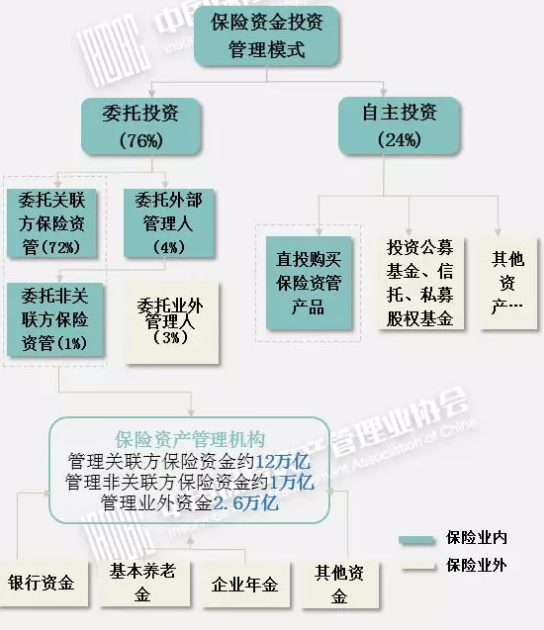 在大资管时代,资管行业的竞争加剧也使得保险公司在努力加强自身投资能力的同时更多地将保险资金向外部非关联方延展。行业已基本形成了以保险机构为主,业外受托管理机构为辅的基本管理模式。