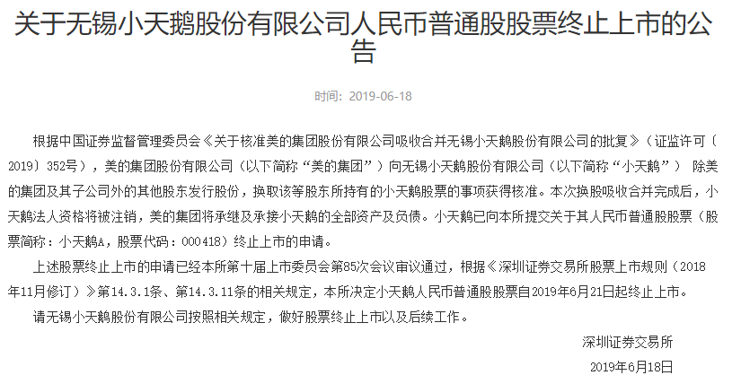 深交所决定小天鹅人民币普通股股票自2019年6月21日起终止上市。