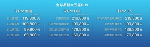 据了解,在发布会现场,无论性能、外观,宋pro都极尽吸引力,在价格公布时更引发现场狂潮。新车集越级大五座空间、全擎全动力、众多智能黑科技于一身,为Pro时代中国主流家庭而来。燃油、双模、纯电三大动力,共计12款车型重磅登场,其中,宋Pro燃油官方指导价8.98万—11.98万元;宋Pro DM综合补贴后价格16.98万—21.98万元;宋Pro EV综合补贴后价格17.98万—21.98万元。