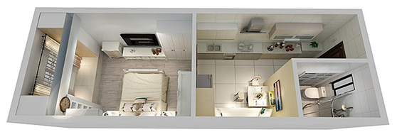 利用进门过道的空间,打造成“一字型”料理台,可容纳三人同时操作;洗菜、切配、烹饪,功能合理区分。