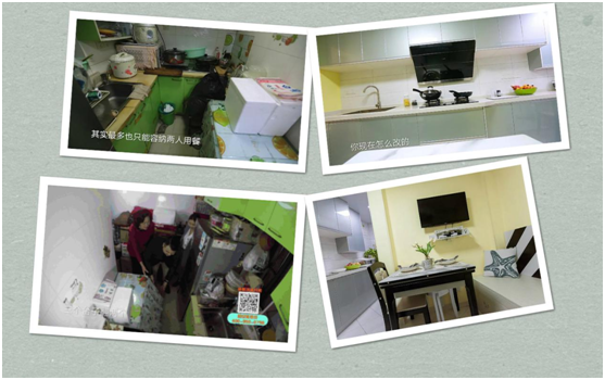 局促的厨房仅能容纳下两人,狭小的台面无法满足徐阿姨的烹饪需求;电饭煲,炒锅随意摆放,导致整个厨房动线混乱不堪。