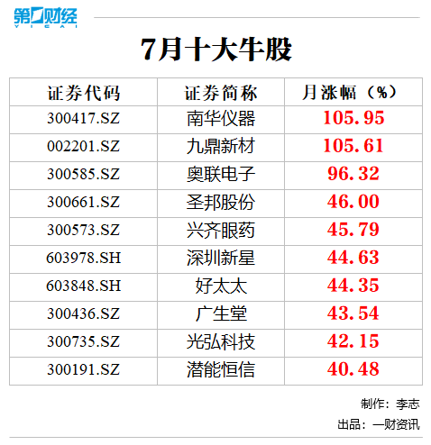 尽管7月份A股市场总体保持窄幅震荡,但也有不少个股风生水起,在剔除2019年上市的新股后,排名前十的牛股7月份涨幅翻倍的有2只,并且涨幅全部超过了40%。十大牛股中,科技股、重组股、中船系概念表现较强。