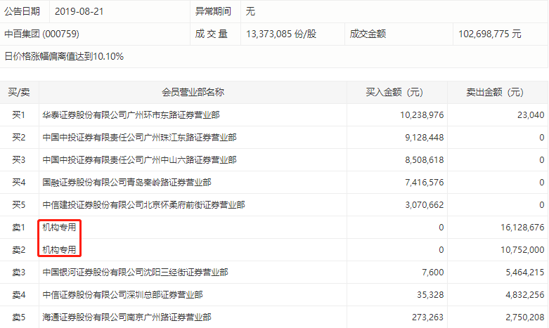 中百集团收报7.68元,涨10.03%,偏离值10.10%,成交额1.03亿元,换手率1.97%。龙虎榜数据显示,今日共2个机构席位出现在龙虎榜单上,分别位列卖一、卖二,合计净卖出2占龙虎榜净卖额的2115.05%,是今日龙虎榜中遭机构净卖出最多的个股。