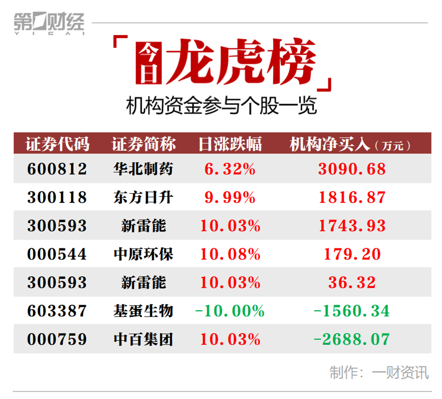 当天机构净买入前三的股票分别是华北制药、东方日升、新雷能,净买入金额分别为3091万元、1817万元、1744万元。