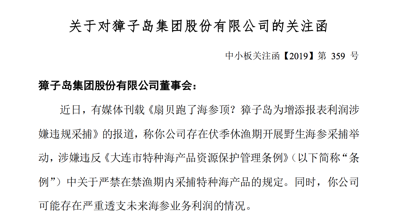 业绩同比剧降,深交所火速向獐子岛下发关注函,要求獐子岛认真核查相关事项并在10月17日前做出书面说明和披露。关注函中要求獐子岛说明公司在伏季休渔期采捕海参的合理性,是否有利于公司海参业务可持续发展,是否存在报道中所述对海参资源进行破坏性采捕、严重透支公司海参业务未来利润的情形。这已经是獐子岛今年以来第六次被深交所关注和问询。