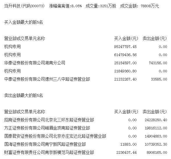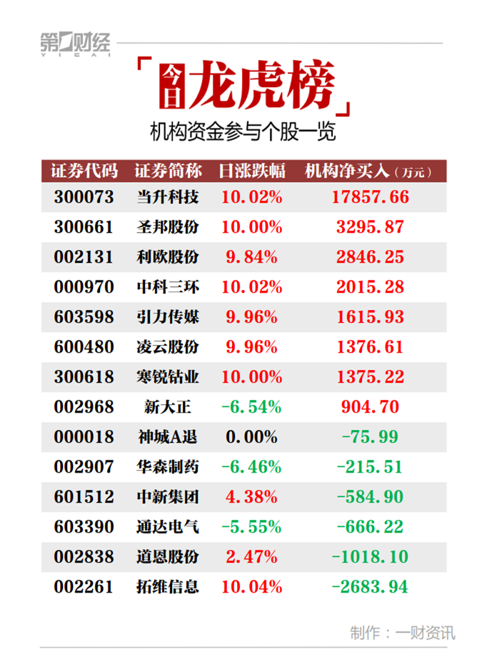 当天机构净买入前三的股票分别是当升科技、圣邦股份、利欧股份,净买入金额分别是1.79亿元、3296万元、2846万元。