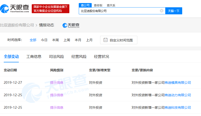 天眼查数据显示,比亚迪的运营主体比亚迪股份有限公司于近日成立三家全资子公司,分别为弗迪模具有限公司、弗迪科技有限公司、弗迪动力有限公司,注册资本为共计3亿人民币。
