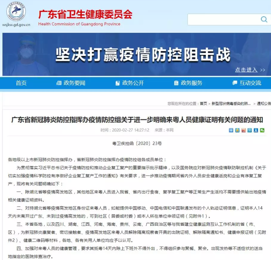 一、除湖北省等疫情高发地区,其他地区来粤人员进入我省、省内出行食宿、复学复工复产等正常生产生活均不需要提供输出地疫情相关健康证明资料。