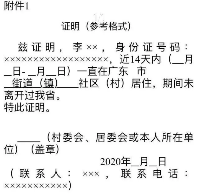 二、对持湖北省等疫情高发地区身份证来粤人员,如能提供中国移动、中国电信和中国联通发布的个人轨迹证明信息,证明本人14天内未离开过广东、未到过疫情高发地的,可到社区(居委或村委)或本人所在单位申领证明(见附件1)。