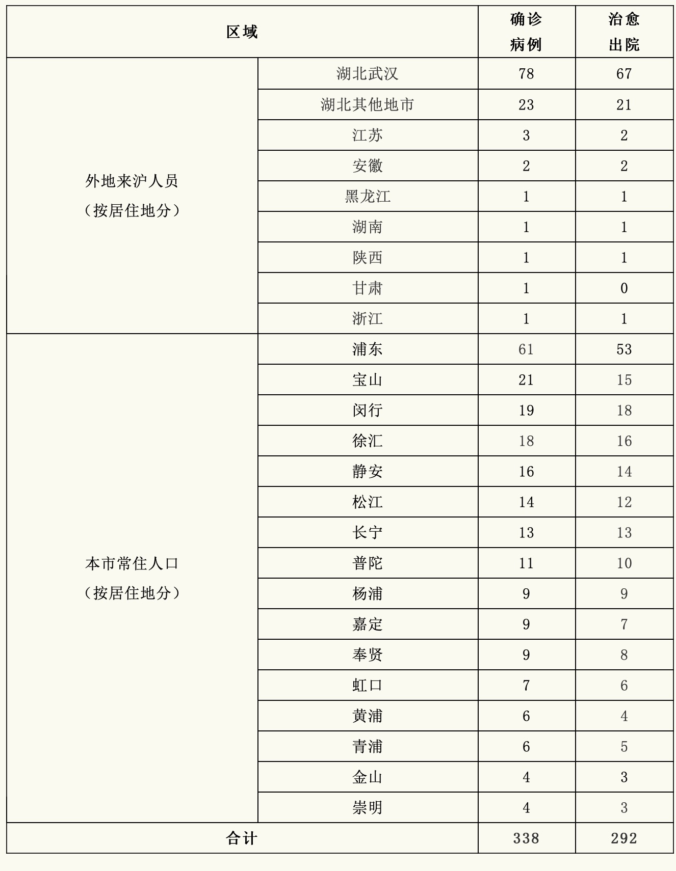截至3月2日24时,上海市已累计排除疑似病例2433例,发现确诊病例338例。确诊病例中,男性176例,女性162例;年龄最大88岁,最小7月龄;145例有湖北居住或旅行史,34例有湖北以外地区居住或旅行史,158例有相关病例接触史,1例流行病学调查正在进行中;外地来沪人员111例,本市常住人口227例。具体情况如下: