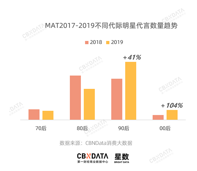 而在品牌代言合作方面,相比去年,90后、00后明星的代言数量都有足量的增长,尤其00后明星,代言增长率达到104%。不止是消费者,已经有更多的品牌主注意到了他们迅速崛起的消费影响力。