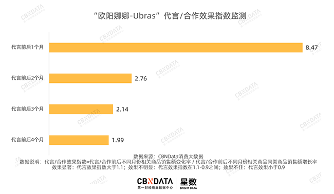 以与内衣品牌Ubras的代言合作为例,CBNData星数分析了其代言后的合作效果指数,在代言的第一个月内指数高达8.47,确实为品牌带来了非常实际的销售成绩。在代言官宣之后的三个月,合作指数仍然维持在“效果显著”的区间。