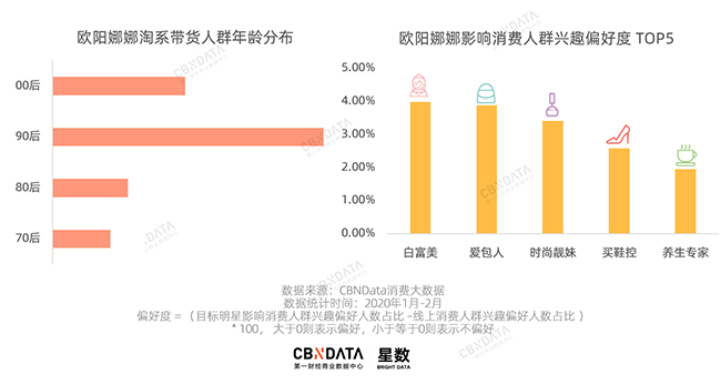 在年轻人群的消费影响力方面,欧阳娜娜确实走到了前列。CBNData星数对欧阳娜娜的“带货粉丝”进行了分析,发现其中90后、00后消费者占了大半,“白富美”、“爱包人”、“时尚靓妹”等三类人群对欧阳娜娜同款的兴趣最高。