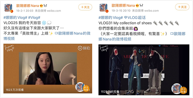 回溯欧阳娜娜的“种草史”,大概要从2018年她的第一支VLOG开始。当年2月,欧阳娜娜在微博发布了首支VLOG,记录日常生活和工作花絮。三年的时间,她总共发布70支VLOG,在微博上获得了近4亿的播放量。