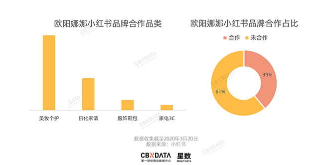 2019年,小红书推出“品牌合作人”平台,所有与品牌进行的商业推送都会带有合作标签。欧阳娜娜2019年发布的59条笔记中,有39%标注着“品牌合作”,其中美妆个护和日化家清类的内容占大头。