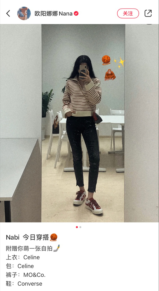 2018年2月,欧阳娜娜开通了小红书。和Instagram、小红书上的穿搭博主们一样,她会在分享穿搭时注明服饰的品牌,这样便于喜爱其造型的妹子们轻松get同款。