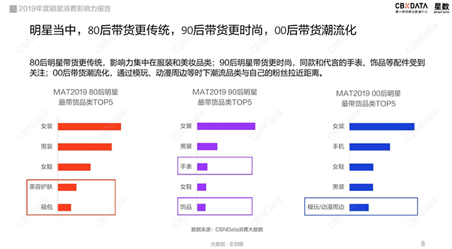 CBNData星数发布的《2019年度明星消费影响力》报告显示,90后和00后明星的带货偏重于服装、饰品、模玩等品类,整体走向更潮流化。
