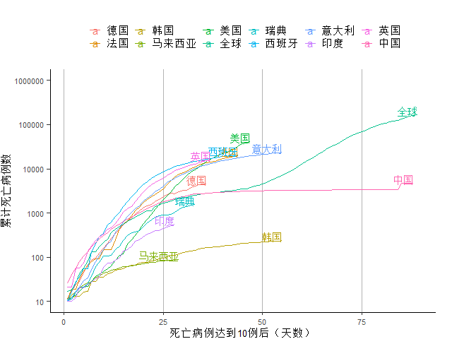 图5 死亡病例到达10例后各主要疫情国家死亡病例