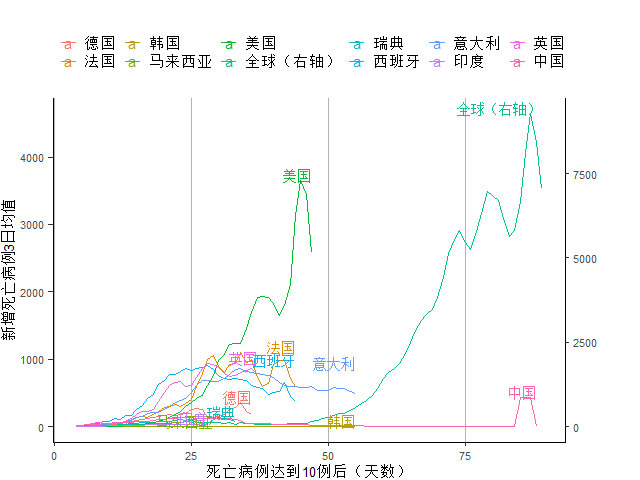 图6 死亡病例到达10例后各主要疫情国家死亡病例增长3日均值