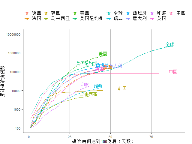 图3 确诊病例到达100例后主要国家累计确诊病例变化